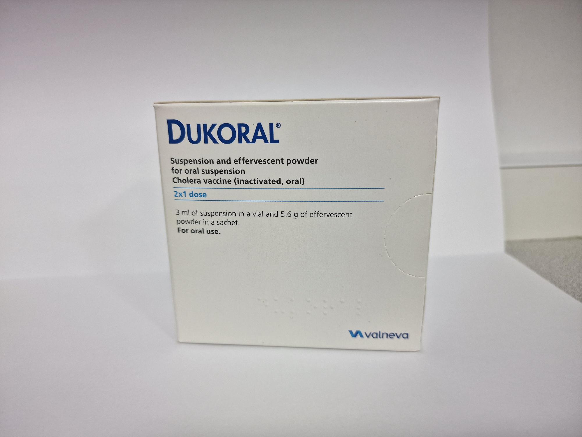 A powdered sachet mixed with 150mls of water. Dukoral suspension vial is added to solution. Resultant solution is consumed within 2 hours